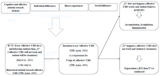 According to Theory of Planned Behavior (TPB) by Ajzen [21], there are two components of attitude. Next to the behavioral attitude, he defines the attitude towards an object as a further variable that in turn influences one’s behavioral attitude [21]. In our context, the attitude towards an object reflects the attitude of teachers towards affected students. In our study with pre-service teachers, we demonstrated that the attitude towards students with ADHD also impacted the intention to apply CMS [20]. Moreover, other variables such as direct experiences, social influences, and individual differences influence attitudes and behavior intention according to the violation-expectation (VoilEx) model by influencing expectations that represent the behavioral attitude [20,23].