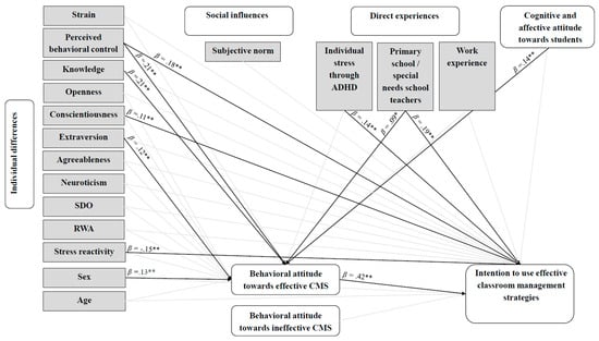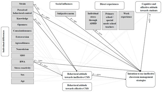 Variance clarification regarding the intention to apply ineffective CMS is at 39%. Variables that contributed positively to variance explanation were behavioral attitude towards ineffective interventions (β = 0.43, p < 0.01), subjective norm (β = 0.08, p < 0.05), individual stress through ADHD (β = 0.11, p < 0.01), and RWA (β = 0.14, p < 0.01). Variables having a negative impact were perceived behavioral control (β = −0.14, p < 0.01) and attitude towards students with ADHD (β = −0.12, p < 0.01).