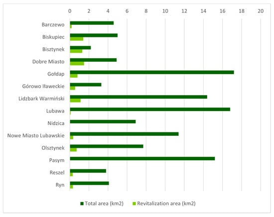 When comparing the revitalization areas in all towns, it can be seen that the largest area was designated for revitalization in Dobre Miasto, then in Biskupiec, Bisztynek, and Lidzbark Warmiński. The smallest area is in Nidzica and Pasym. However, taking into account the ratio of the revitalized area to the total area of the town, the largest area designated for changes was in Bisztynek, then in Dobre Miasto and Biskupiec, and then in Górowo Iławecki, Olsztynek and Lidzbark Warmiński. The smallest area was designated in Pasym and Nowe Miasto Lubawskie (Figure 2).