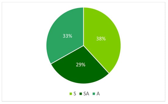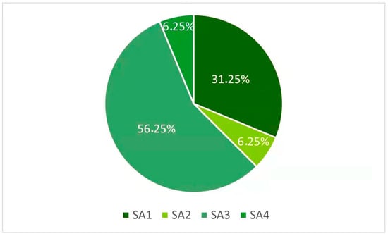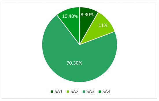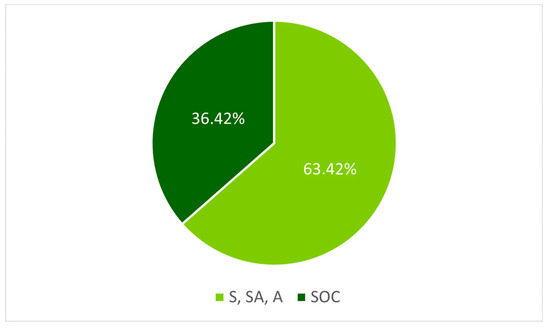 In the Supra-Local Revitalization Program (SLRP), towns have designated a total of 82 projects for implementation. The largest group, 64%, are projects related to spatial development, renovation of architectural objects, and renovation of space around architectural objects (S, SA, A), while social projects (SOC) make up 36% of all activities planned in the program (Figure 5).