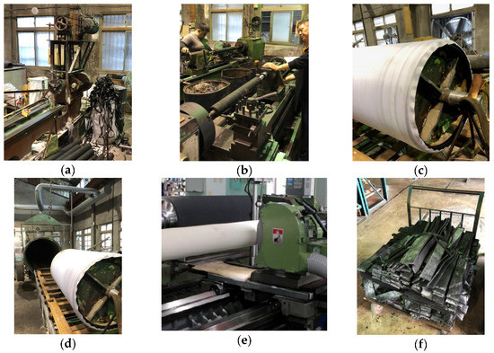 In this paper we study one of the leading rubber manufacturers in Taiwan, which aims at circular rubber material designs. The manufacturer has two main production lines. The first line produces rolling cylinders, rubber rollers, sander wheel, and packing rubber for use by many different industries. The second line reuses the scrap rubber granulates and strips produced by the first line and mixes them with other materials to manufacture light-weight rubber works such as construction materials, barriers, and stand systems for signposting of road works. A typical process of the production is shown in Figure 1. The rubber materials go through several operations including compounding, coating, molding, vulcanization, demolding, and deflashing. During each operation, certain quantities of scrap rubber are yielded, which can be reused to make light-weight rubber products. Some of the products produced by the two lines are shown in Figure 1g,h. An application of the circular rubber products, the stone-like wall rubber, is shown in Figure 1i.