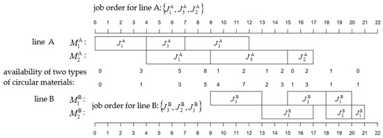 Before presenting the problem formulation, an illustrative example is given to elucidate the CRMP. Assume line A has three jobs and two machines , line B also has three jobs and two machines . The processing time of each job on each operation of line A and the quantities of yielded scrap rubbergranulates and strips from each operation are given in Table 1. Similar descriptive data (yielded materials become the required circular materials) for line B are displayed in Table 2. Figure 2 shows feasible job schedules, for line A and for line B. The obtained makespan is 21.