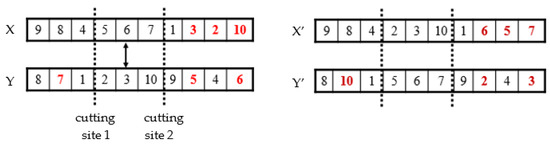 The crossover operation manipulates two parental chromosomes and exchange genes between them to produce offspring chromosomes. The crossover operation is performed with a crossover probability Pc. In other words, N × Pc chromosomes will be manipulated by crossover. As our chromosome structure is represented as a permutation string, the partially matched crossover (PMX) that can reorder the permutation is applied. The PMX crossover resembles the two-point crossover but respects a look-up table to avoid repetitions of gene alleles. The PMX crossover consists of three steps: look-up table establishment, gene exchange, and gene correction. An example is illustrated in Figure 3 where two parental chromosomes X and Y are shown with the PMX crossover to produce two offspring chromosomes X’ and Y’. Firstly, two cutting sites are generated at random, say at 3 and 6. The gene segments between the two cutting sites are used to establish a look-up table, i.e., the list (2, 3, 10) is mapped to (5, 6, 7). Secondly, the gene segments between the two cutting sites are exchanged. Finally, the repetitive genes in the remaining segments due to the exchange are corrected by referring to the look-up table (the corresponding genes before and after correction are printed in red as shown in Figure 3).