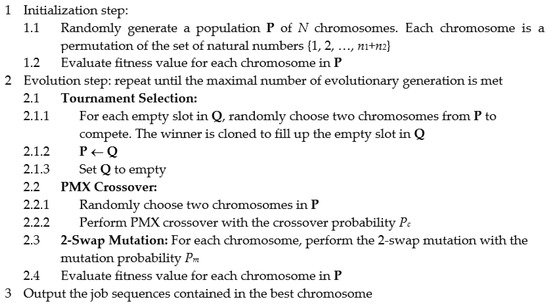 Assuming that there are n1 jobs to be processed by line A and n2 jobs by line B. A feasible job processing schedule to the CRMP problem can be represented by a chromosome integer string as X = ‘’ where and if . In other words, X is an integer permutation where indicates if and indicates if . For example, let there be 4 and 3 jobs to be processed by line A and line B, respectively. A chromosome X = ‘3614725’ indicates the job order for line A and for line B. The fitness value of the chromosome is evaluated by calculating the makespan with the job orders contained in the chromosome. In this context, the lower the fitness value (makespan) is, the better the chromosome.