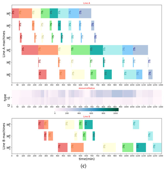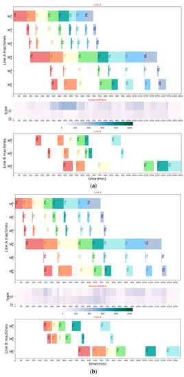 For Line A production arranged by GA, as shown in Figure 5c, the makespan for each machine was similar to that obtained by the Campbell-Dudek heuristic, showing superiority than FCFS. For the Gantt chart in Line B, it seems GA produced a compromised job sequence that balanced between early start-processing time and prudent reserve of necessary materials for later production of critical jobs. We see and compactly finished operations for the first six jobs and then deterred the operations for the last job () in order to reserve the circular materials for the production of on . It is seen that the production in Line B suggested by GA was relatively parallel to enhance the production efficiency, in contrast to those suggested by FCFS and Campbell-Dudek heuristic where all operations on and finished very early and left to proceed with operations of later jobs without parallelization with the other machines, which is the main reason there was a long makespan.