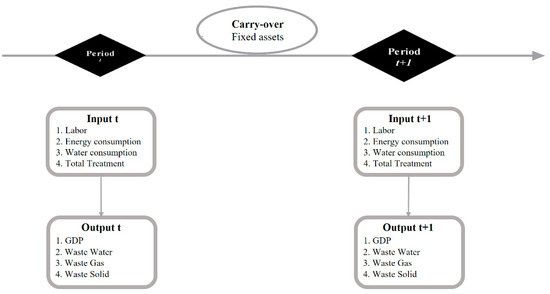 We first assume that due to differences in management types, resources, regulations, or environments that all manufacturers are composed of DMUs in groups—namely, (). We then assume that the DMU exists in each time t, where t = 1, …, T. In each time period, inputs produce desirable outputs and undesirable outputs , and is the carryover variable. Under the common boundary, the DMU can choose the most favorable final output weight to maximize its efficiency value. Therefore, the efficiency of DMU k under the common boundary can be solved by the following linear programming procedure.