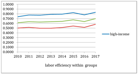 From 2010 to 2017 (see Figure 2), the average labor efficiency in China has shown an upward trend, from 0.6129 to 0.6988, and the allocation of labor resources has been continuously optimized. The average labor efficiency of the high-income groups in each year is higher than the national average labor efficiency, while the average labor efficiencies of the upper-middle-income groups are lower than the national average labor efficiency.