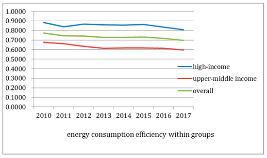 From 2010 to 2017 (see Figure 3), China’s average energy consumption efficiency presents a downward trend, from 0.7727 to 0.6957. The average energy consumption efficiency of the high-income groups in each year is higher than the national average energy consumption efficiency. However, the average energy consumption efficiencies of the upper-middle-income groups are lower than the national average energy consumption efficiency.