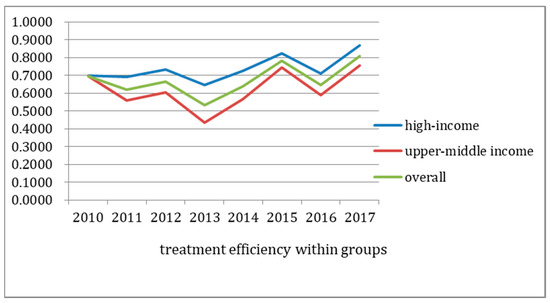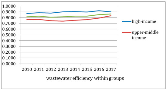 From 2010 to 2017 (see Figure 7), the average wastewater treatment efficiency in China has shown an upward trend, rising from 0.8139 to 0.8641. The average waste gas treatment efficiencies of the high-income groups are higher than the average wastewater treatment efficiencies of the middle- and high-income groups. Moreover, the wastewater treatment efficiencies of the upper-middle-income groups are all lower than the national average wastewater treatment efficiency.