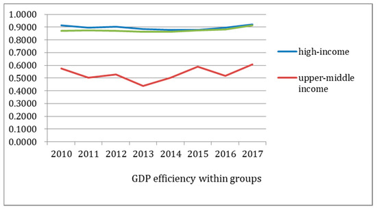 From 2010 to 2017 (see Figure 6), China’s GDP efficiency average has shown an upward trend, rising from 0.8700 to 0.9149. The average GDP efficiency of the high-income group in each year is higher than the average GDP efficiency of the national and upper-middle-income groups. Contrarily, the GDP efficiency of the upper-middle-income group is lower than the national average GDP efficiency.