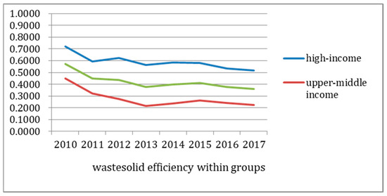 From 2010 to 2017 (see Figure 9), the average value of China’s solid waste treatment efficiency exhibits a downward trend, from 0.5014 to 0.3619. The average solid waste treatment efficiency of the high-income groups in each year is higher than the average solid waste treatment efficiency of the country and the upper-middle-income groups, and the solid waste treatment efficiencies of the middle- and high-income groups are all lower than the national average solid waste treatment efficiency.