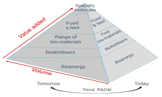 Yet, waste and by-products from the olive oil production should not only be considered from a mere ‘management or treatment’ point of view but can offer opportunities to be valorized, i.e., to be converted into new value-added and marketable ingredients and products, potentially leading to additional farmers’ incomes. The different conversion strategies based on a broader bioeconomy perspective can be divided into different categories of biomass upgrading [28]: specialty molecules, food and feed ingredients, industrial bio-based materials, bio-fertilizers and bioenergy, with different priorities as shown in the biomass value pyramid (Figure 1). Using biomass for energy needs the highest volume but has the lowest priority. Bio-fertilizers and bio-materials have more value, followed by food and feed ingredients. The highest value-added from the lowest volume is reached within the fine chemical or pharmaceutical sector (health and lifestyle).