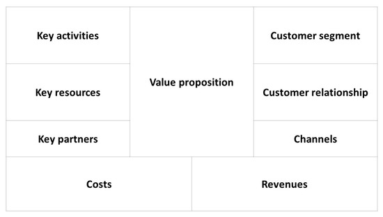 Business models linked to the circular economy is a recent field of research, although the number of publications has significantly increased in the past years [19,22,23,39,40,41,42,43]. A business model in general describes how a firm does business [44]. It refers to the logic of a firm, the way it operates, and how it creates value for its stakeholders [45]. The Business Model Canvas (Figure 2) developed by Osterwalder and Pigneur [46] is the most common conceptual model and often used for designing new or analyzing existing business models. It consists of nine different components or building blocks that cover the four main areas of a business: (i) the infrastructure needed for the value creation and encompassing key activities, key resources, and key partners, (ii) the central element value proposition, i.e., the products and/or services offered, (iii) the value delivery, including customer segment, customer relationships as well as marketing/distribution channels, and (iv) the value capture area with the financial components costs structure and revenue streams