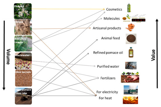 The Mediterranean region, covering the countries surrounding the Mediterranean Sea from Europe, Africa, and Asia, is currently facing a wide range of sustainability challenges such as population growth, poverty, inequalities in the production sector, inadequate food supplies, food and nutrition security, changes in dietary patterns, environmental degradation, climate change, and political instability [1]. The most important challenge for the agrifood sector is “providing enough food, in quantity and quality, to meet the nutritional needs of global populations while simultaneously conserving natural resources and ecosystems for present and future generations” [1] (p. 1). This objective corresponds well to the sustainability definition of the 1987 Brundtland report ‘Our Common Future’ by the World Commission on Environment and Development, stating that “Sustainable development is development that meets the needs of the present without compromising the ability of future generations to meet their own needs” [2]. Agriculture still represents a strategic sector for the socio-economic development of Mediterranean countries in terms of employment and incomes. In Southern Mediterranean countries, 20–30% of the population work in this sector. However, the increase of agricultural production, often through intensification and external inputs, is leading to negative externalities on the environment, such as land degradation, greenhouse gas emissions, and loss of biodiversity [1]. Agriculture is the main water consumer in this region where its scarcity requires intelligent agricultural growth schemes and efficient usage of all agro-resources produced [3]. Mediterranean countries need to produce more food with fewer resources, using them more sparingly [4]. Moreover, food losses and waste deteriorate the efficiency of the food chains and therefore contribute to food and nutrition insecurity [5]. Within the Mediterranean agrifood system, olive and olive oil production is a key element, largely known as a culinary specialty and as part of the Mediterranean heritage and diet, also for its health and medicinal effects. Olive oil production has increased over the past decades, as a valuable source of antioxidants and essential fatty acids in the human diet [6]. Olive oil constitutes one of the most important dietary trends worldwide, including considerable trading volumes [7]. With more than 3 million tons of olive oil produced globally per year, the sector offers significant revenues and employment, especially in rural areas. The by far most important olive oil-producing country is Spain (more than one-third of the overall worldwide production), followed by Italy, Greece, Tunisia, Turkey, and Morocco [8]. However, olive oil production generates huge amounts of olive waste (wood, branches, leaves) and by-products (olive pomace, olive mill wastewater, olive stones) with an important environmental footprint. These residues are not only undesirable in terms of sustainability and environmental impact, but also create high costs for management and disposal [9].