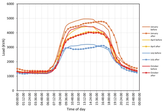 The results from the research also identified a relationship between the load demand, ambient temperatures and radiation levels. Although cloud cover increased in the summer season due to precipitation [54], ambient temperatures simultaneously increased due to an increase in radiation levels. As a result, the load demand from the case study increased due to increased cooling loads. Research conducted by Seneviratne [55] estimates that cooling accounts for 5 to 24% of a shopping centre’s total electrical load.