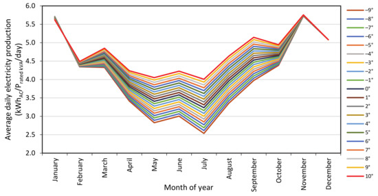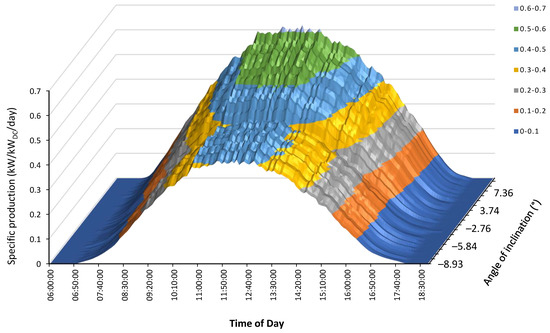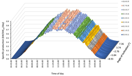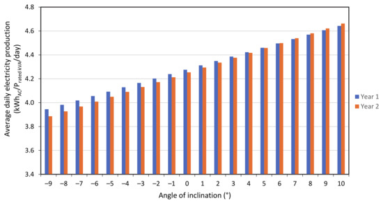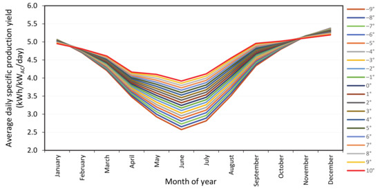 The literature [56,57] and results from the research indicate that there is a relationship between the electricity yield and the angle of tilt (β) and orientation on the azimuth (Ѱ). Peak average daily specific yield of 4.7 kWh/kWAC/day is obtained when the PV modules are mounted such that Ѱ = 6° and Ѱ = 7° in a north north-easterly direction and βopt = 28°. The lowest average daily specific yield of 3.1 kWh/kWAC/day is observed when the PV modules are mounted such that Ѱ = −180° = 180°. It was found that there is an average reduction of 0.926%/1° when the angle of tilt is reduced from 30° to 0° in the northerly direction. However, due to practical and shading restrictions, PV modules are installed such that −10° ≤ β ≤ 10° when commercial-sized PV systems are affixed to roofs of buildings. It was also concluded that the geographical location of the PV system affects the electricity yield.
