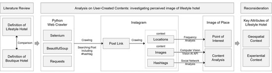 The literature review establishes an understanding of the current definition of the lifestyle hotel sector. Then, the shared attributes of lifestyle hotels are explored. User-created content on Instagram, an image-sharing social networking site (SNS), are analyzed. Instagram is a representative photo-sharing platform that is widely used throughout the world. Analyzing user-created content on Instagram provides us with various information based on images that show specific spaces or targets [19]. Images are a communication tool for understanding impressions of physical environments; thus, visual methods allow us to understand effectively how users view the physical world [20]. The hashtags provide complex materials, such as information, thoughts, and emotions towards spaces or targets illustrated in the photos. In particular, an Instagram post with a location tag can help us understand social behaviors within a particular place from diverse perspectives [21,22]. Therefore, Instagram data show users’ holistic experiences in a place and their perceptions of these specific locations.
