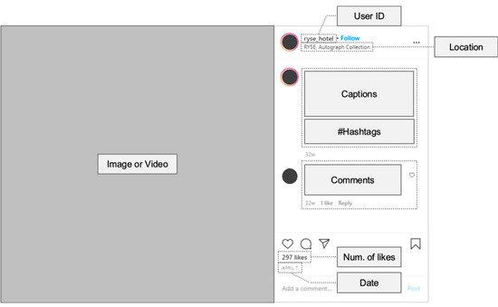 This study explored customers’ perceptions of lifestyle hotels by analyzing big data retrieved from their Instagram posts. Figure 2 shows the basic structure of an Instagram post. The data collected from a post included ID, location, image (or video), caption, hashtags, comments, number of likes, and the date of posting. From Instagram, posts can be searched using a specific hashtag, location, or user ID, and the results are shown in the chronological order. For this research, we collected Instagram posts containing lifestyle hotel and boutique hotel hashtags, as the hashtags generated by a user who posted a related image represent the same explanation for other users [43].