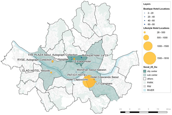 First, we selected highly ranked locations as POIs through a frequency analysis, which examined 20,886 lifestyle hotel posts and 24,161 boutique hotel posts. The geographical standard of the city was based on the urban planning system of Seoul [44]. POI was defined on the basis of the spatial analysis conducted to find the locations that people often visited and perceived as a lifestyle or a boutique hotel.