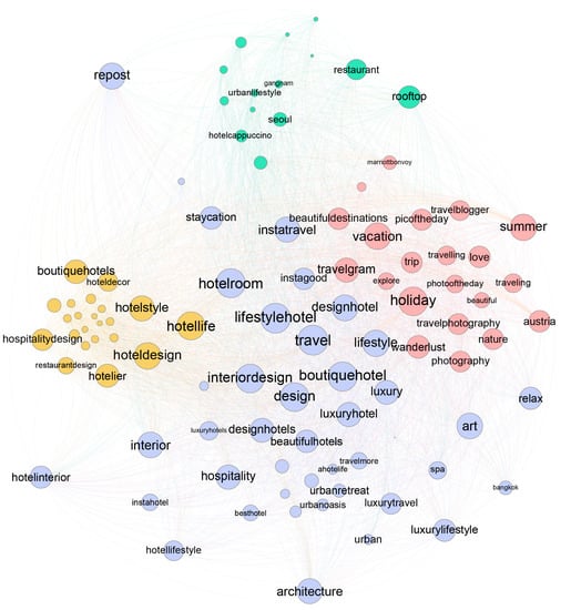For hashtag analysis, the top 100 hashtags with higher frequencies for each hotel were selected to identify the shared characteristics. In this stage, hashtags that only indicated “hotel” were excluded from the analysis. Then, a semantic analysis was conducted on how Instagram users perceived lifestyle and boutique hotels through an SNA on the key hashtags. This study utilized the metrics for SNA provided by Gephi, a visualization and exploration software for the network. SNA was performed by calculating the eigenvector centrality, which implied the significance of a node within a network [45]. Following this process, the research investigated the meaningful hashtags found in SNS posts. Based on the results obtained, a semantic analysis was conducted on how Instagram users perceived lifestyle hotels and their main differences from boutique hotels.