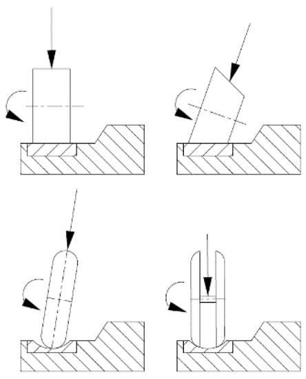 The essence of the milling process in the roller mills consists of a mutual interaction of mechanical forces exerted on two surfaces, where one of them rolls on the other one, and between them there is the milled and shredded material. The feed forces are exerted from the mill’s grinding media by the gravity forces, springs or a hydraulic clamp. The bodies of revolution in the form of rolls, toruses, tapers or pebbles act as grinding media. Grinding media always roll along the bearing surface, which is made of bowls of flat or shaped materials. In the known designs of mills for brands such as Loesche, Pfeiffer, Polysius and others, the grinding media have the diameter from 200 to 2500 mm [14,15,16]. They guarantee the material’s crushing effectiveness on the level from 2 to 500 t·h−1.