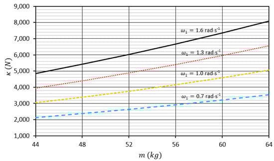 In Figure 3, the impact of the milling roller’s mass m made of steel on the value of the dynamic reaction κ for the assumed angular speeds ω1 is presented.
