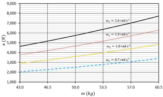Figure 4. Impact of the roller’s mass m made of cast iron and its angular speed ω1 on the dynamic reaction’s value κ