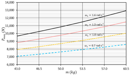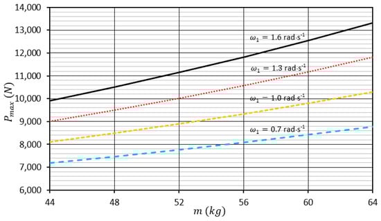 Figure 6. Impact of the roller’s weight m made of cast iron and of its angular speed ω1 on the value of dynamic reaction Pmax.
