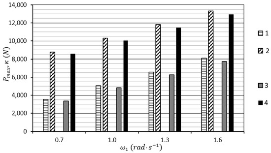 In Figure 5, the impact of the milling roller’s weight m made of steel on the value of reaction Pmax for angular speeds ω1 is presented.