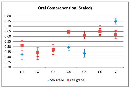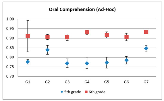 In accordance with the Prolec-R norms, for the oral comprehension test, at the beginning of Primary 5 and end of Primary 6 all of the groups present a direct score which is within the normal development for their age. Significant intragroup and size differences of the mean effect are only found—after the assessments throughout the two years—in a positive way in the experimental groups #4 (t(18) = 3.49, p = 0.0026, d Cohen = 0.80) y #5 (t(21) = 4.36, p = 0.0003, d Cohen = 0.93) and in a negative way in the control group #7 (t(24) = −3.4123, p = 0.0023, d Cohen = −0.68). See Figure 1.