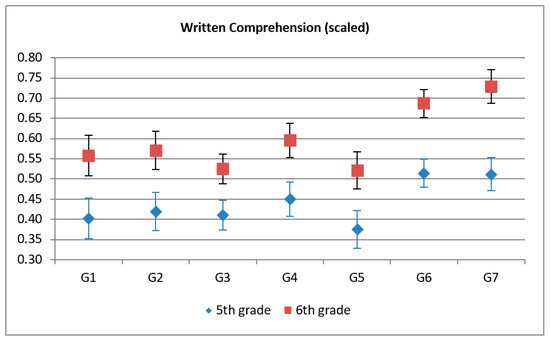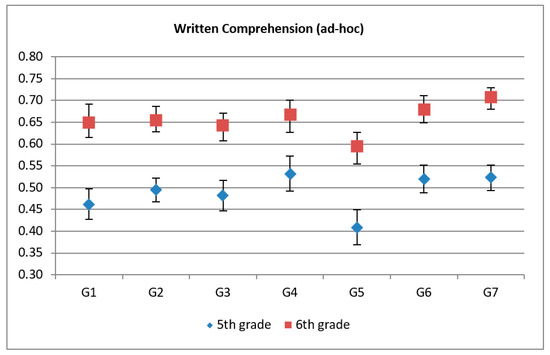 All of the students showed a considerable improvement. In all the groups the difference between the pre-and post-test (scaled written comprehension) is significant with a large effect size (group 1, t(18) = 4.6889, p = 0.0002, d Cohen = 1.08; group 2, t(17) = 5.4251, p = 0.0000, d Cohen = 1.28; group 3, t(24) = 4.6203, p = 0.0000, d Cohen = 0.92; group 4, t(20) = 5.8387, p = 0.0000, d Cohen = 1.27; group 5, t(22) = 4.8298, p = 0.0000, d Cohen = 1.01; group 6, t(21) = 5.2301, p = 0.0000, d Cohen = 1–12; group 7, t(24) = 8.8354, p = 0.0000, d Cohen = 1.77). See Figure 3. The results are similar in the ad-hoc test. All of the groups show a considerable improvement which results in significant differences in all the groups with a large effect size (group 1, Z = 3.608, p = 0.0003, d Cohen = 1.33; group 2, Z = 3.807, p = 0.0001, d Cohen = 1.43; group 3, Z = 3.910, p = 0.0001, d Cohen = 1.06; group 4, Z = 2.899, p = 0.0037, d Cohen = 0,85; group 5, Z = 4.299, p = 0.0000, d Cohen = 1.57; group 6, Z = 3.365, p = 0.0008, d Cohen = 1.01; group 7, Z = 3.980, p = 0.0001, d Cohen = 1.36). See Figure 4.