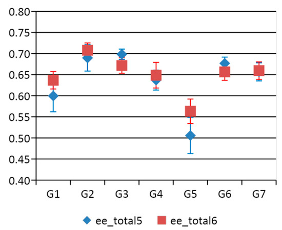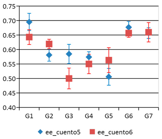 In the case of the data obtained with the set carried out ad hoc, the results of the different groups have been more homogeneous. We have found large size effects and significant positive intragroup differences in all of them (group 1, Z = 3.558, p < 0.0004, d Cohen = 1.06; group 2, Z = 2.616, p < 0.0089, d Cohen = 0.64; group 3, Z = 3.840, p < 0.0001, d Cohen = 1.05; group 4, Z = 3.836, p < 0.0001, d Cohen = 1.20; group 5, Z = 4.110, p < 0.0000, d Cohen = 1.13; group 6, Z = 3.720, p < 0.0002, d Cohen = 1.17; group 6, Z = 3.600, p < 0.0003, d Cohen = 100). See Figure 2.