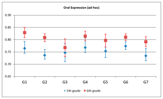 The data for ad-hoc oral expression show that there is an improvement in all the groups, although the intragroup differences are only significant in experimental group 2 (t(22) = 2.7126, p = 0.0127, d Cohen = 0.57) and control group 7 (t(22) = 2.5171, p = 0.0196, d Cohen = 0.52) with a middle size effect; see Figure 7.