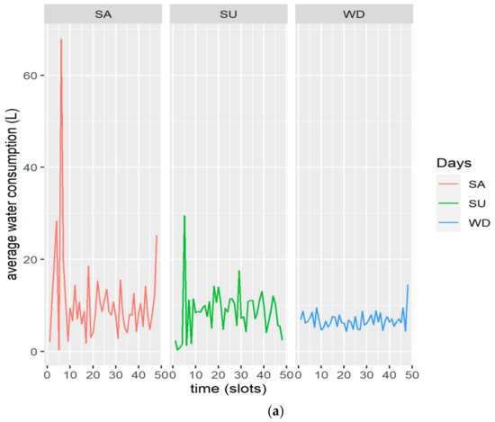For the construction of these curves, consumptions are transformed into an index series format, by grouping data in two-week intervals, and transforming the whole time-series into 15 two-week profiles summarizing half hourly data separately for weekdays, Saturdays, and Sundays. Index series format is what the water utility would use to model water consumption for customers, i.e., changing the assumed consumption profile every two weeks, following similar practices already employed for electricity consumption [9]. In our case, the two-week index series is scaled by taking into account not only the consumption of the two-week period, but also the cluster customers 7-month water use, to calculate the estimated water time-series (Equation (1)) [51]: