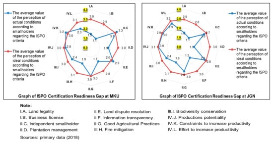 The 12 values as results of assessment are presented in Figure 1, showing various gaps between what is happening (actually) in reality and what should expectedly (ideally) be achieved. The wider the gap between the actual and ideal values indicates the greater the chance that respective smallholders are unprepared to understand, follow and comply with ISPO attributes or indicators. Figure 1 found a similar pattern of readiness between smallholders of MKU Village and JGN Village to adopt ISPO. It particularly applies to most social and economic aspects of ISPO. There is a relatively better level of preparedness and willingness of both smallholders to (1) independently organize farming organizations, (2) resolve arising land disputes, (3) implement good agricultural practices, (4) increase crop production and (5) handle the constraining factors of productivity, and finally (6) make efforts to increase productivity.