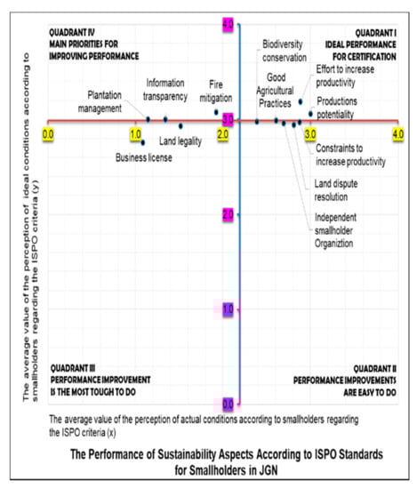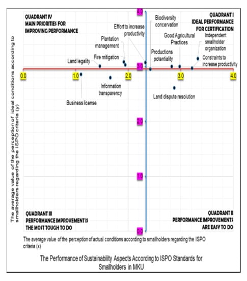 The ISPO criteria that are considered to be the main priority to help improve smallholders’ readiness in ISPO certification performance are those which are located in Quadrant IV. These criteria are considered to be much easier to handle. Meanwhile, the ISPO criteria in Quadrant III are the second priority because they are the most difficult to handle. More effort and energy need to be acquired to shift the ISPO criteria from Quadrant III to Quadrant I.