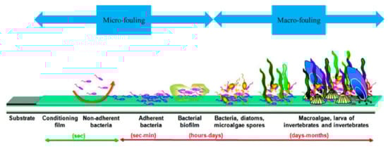 Actions of a biological nature result from the interaction between the material and the marine organisms that colonize the surface, leading to biofouling. Biofouling in the marine environment is described as the colonization of any solid surface, living or dead, natural or artificial, by micro- and macroorganisms. Biofouling formation is hence a phenomenon common to the majority of materials submerged in seawater [37,38,39]. It is generally divided into two main stages: microfouling and macrofouling (Figure 1). The submerged material is quickly colonized by marine bacteria, which form a bacterial biofilm on the surface (microfouling). This bacterial biofilm facilitates colonization by other micro- and macroorganisms such as cyanobacteria, fungi, diatoms, barnacles, algae and protozoa (macrofouling) [40,41,42,43,44,45].