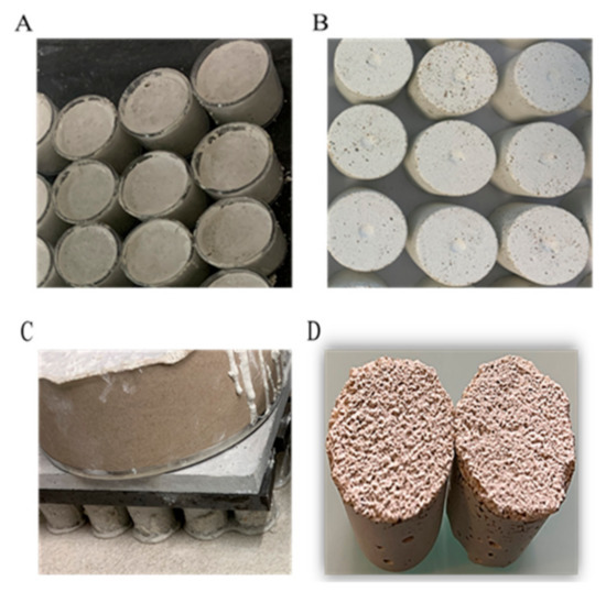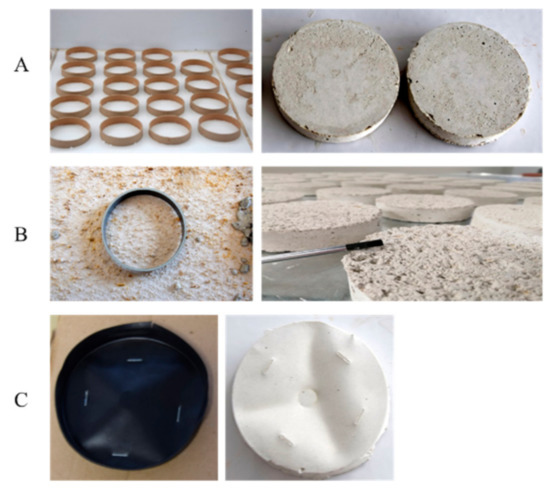 After mixing, the mortars were cast in cylindrical molds measuring 2.7 cm in diameter and 2.9 cm high. After 24 h of hardening, the mortar specimens were removed from the molds and placed in a laboratory room at 20 °C for 30 days (Figure 2).