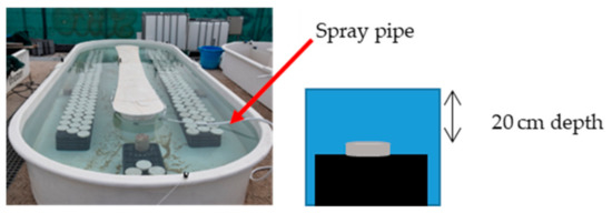 An immersion test in seawater was carried out using flat-bottomed basins (polyester, 6 m long, 0.6 m high and 2 m wide) located at the IFREMER station (biology of exploited marine organisms research unit in Palavas, France). The basins featured a seawater inlet and outlet allowing for an open seawater circuit (Figure 5). To ensure that the experiment would be completed smoothly and avoid contamination of any type, the basins were cleaned before the cementitious material specimens were placed in them.