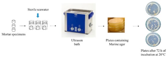 After each incubation period, three specimens of each mortar type were placed in three sterile tubes containing 10 mL of sterile seawater. Bacteria adhering to the mortar surface were detached by immersing the tubes in an ultrasonic bath (Bandelin SONOREX™) for 10 min at 20 °C. The solution obtained was diluted using sterile seawater, then 100 µL of diluted solution was spread on plates containing MA (Dutscher, 490614). The plates were then incubated at 20 °C, and a colony count was performed at least 72 h after incubation. The results are expressed as colony-forming units per cm3 of mortar (CFU/cm3).