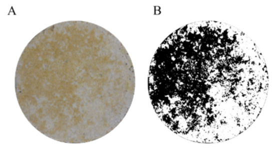 For the image-analysis-based method, photographs of the concrete specimens were taken using a Nikon D5300 camera. The photographs were taken under constant lighting using a photography lab. The images were subsequently processed using the ImageJ 1.38x software [83]. To distinguish the biofouling from the noncolonized surface of the concrete, a threshold color was used in the CIE Lab color space. Afterward, the images were processed with a binary system (Figure 8) to obtain white pixels (noncolonized area) and black pixels (colonized area, biofouling) from the initial photograph. These data were compiled and used to calculate the biofouling coverage for each concrete type as a percentage of surface area.