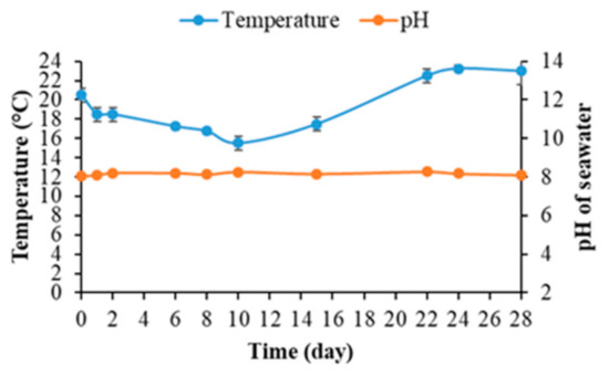 Marine environmental conditions such as seawater temperature and alkalinity influence bacterial growth and biofilm formation [88,89,90]. In order to ensure that environmental conditions were favorable to the growth of marine bacteria during this study, the temperature and the alkalinity of seawater used in this experiment were measured throughout the immersion period (Figure 9).