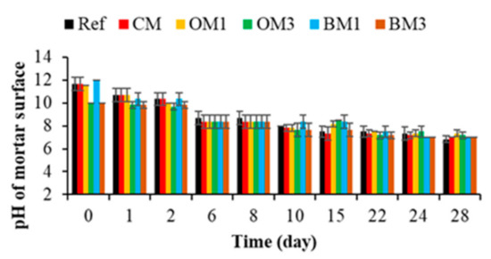 Figure 10 shows that the pH of the CEM I mortar specimens (Ref, CM, OM1 and BM1) at T0 was around 11.7. The pH was also verified using phenolphthalein indicators, which gave a pink coloration after contact with the surface of the specimens, indicating a pH higher than 9. Therefore, the surface pH measured was lower than expected (pH~13) [101,102]. This might be due to the 30 days of contact between air and mortar specimens before the start of the immersion test. In such conditions, mortar specimens undergo a carbonation reaction due to the presence of carbon dioxide. Carbon dioxide from air reacts with calcium hydroxide and calcium silicate hydrate in the mortar to form calcium carbonate and water. This carbonation reaction decreases the pH of mortar specimens [104,105].