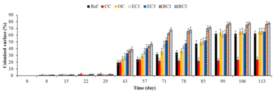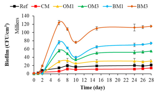 Figure 9 shows that the seawater temperature remained between 16 and 23 °C depending on variations in the weather at IFREMER’s outdoor experimental platform in Palavas-les-Flots over the course of the experiment. During the subsequent process of bacterial-biofilm quantification, the seawater temperature was optimal for the growth of most marine bacteria [75,91,92,93].