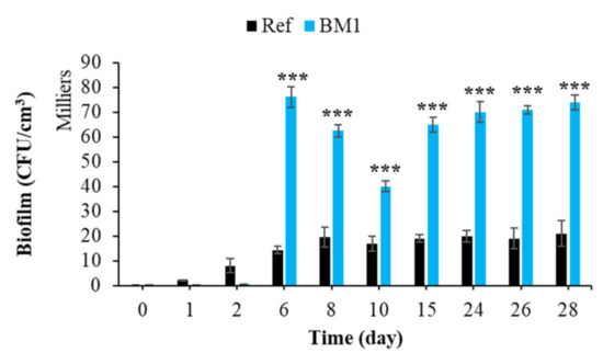 Quantification of bacterial biofilm on smooth and rough mortars. Each experiment was performed in triplicate, and the error bars present the standard deviation of the values obtained. Ref = control mortar; BM1 = biomimetic mortar prepared with CEM I. The experiments highlighted with asterisks differed significantly from the control (Bonferroni; ***: p < 0.001) at the indicated time.