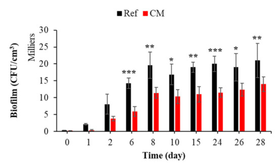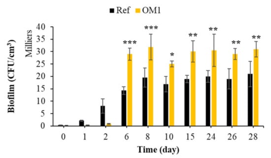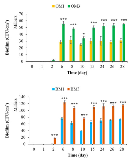 Quantification of bacterial biofilm on CEM1 and CEM3 mortar specimens. Each experiment was performed in triplicate, and the error bars present the standard deviation of the values obtained. Ref = control mortar; OM1 = oiled mortar prepared with CEM I; OM3 = oiled mortar prepared with CEM III; BM1 = biomimetic mortar prepared with CEM I; BM3 = biomimetic mortar prepared with CEM III. The experiments highlighted with asterisks differed significantly from the control (Bonferroni; *: p < 0.05, ***: p < 0.001) at the indicated time.