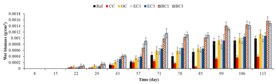 The principle of the wet-weight biomass measurement technique was the same as that of the dry biomass quantification technique, i.e., quantifying the weight of the marine fouler organisms adhered to the concrete specimens. To apply this technique, the weight of 15 concrete specimens was measured before they were immersed using scales (Sodipro, 300619, accuracy 1 g). Since concrete is a porous material, the immersed specimens absorb water and increase in weight. Then, the weight of these specimens after 15 days of immersion was taken as W0 (concrete + absorbed water weight), and the weight of biomass was subsequently calculated by subtracting the weight obtained after X days of immersion (Wx) from W0. Before the evaluation of W0 and Wx, the concrete specimens were drained for 15 min. This quantification method was applied at 0, 8, 15, 22, 29, 43, 57, 71, 78, 85, 99, 106 and 113 days of immersion using 15 replicates of each concrete type; the data are reported as grams of biomass (g) per cm2 of concrete surface (g/cm2).