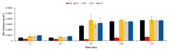 For the dry-weight biomass measurement technique, the first step was to recover the marine fouler organisms from the concrete surface. The recovered cells were placed in tubes and dried at 60 °C for 24 h [80]. The weight of dry biomass was then measured using scales (accuracy 0.01 g). This quantification method was applied at 71, 78, 85, 99, 106 and 113 days of immersion using 3 replicates of each concrete type per time; the data are reported as grams of biomass (g) per cm2 of concrete surface (g/cm2).