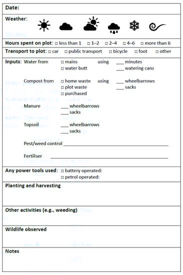 Volunteers were sent an allotment “diary”, with a separate page to fill out for each allotment visit (Figure 1). They were asked to fill their diary out each time they visited their allotment, for a full year, with participant recruitment and therefore start date spanning December 2017 to March 2018. Participants were also asked a number of general questions about their allotment, including length of tenancy, whether they grew organically, use of peat free compost, number of people working on the plot, and yearly rent prices (Supplementary Materials). A pilot study was first conducted with volunteer gardeners on an existing citizen science project to refine the diary pages.