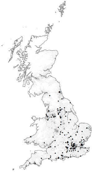 - Reis, S.; Liska, T.; Steinle, S.; Carnell, E.; Leave, D.; Roberts, E.; Veino, M.; Beck, R.; Dragosits, U. UK Gridded Population 2011 Based on Census 2011 and Land Cover Map 2015; UK Centre for Ecology & Hydrology: Midlothian, UK, 2017; Available online: https://doi.org/10.5285/0995e94d-6d42-40c1-8ed4-5090d82471e1 (accessed on 1 March 2021).